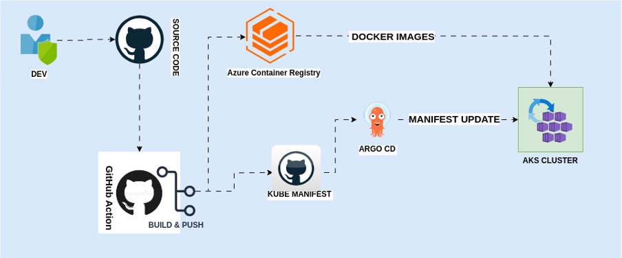 ● The CD pipeline updates the Kubernetes manifests with the latest Docker image tag, ensuring the deployment configuration references the newly built Docker image.