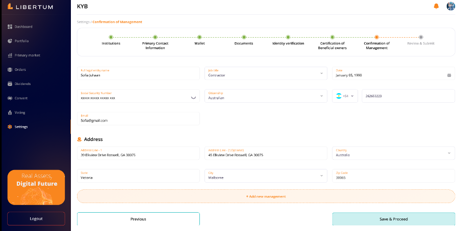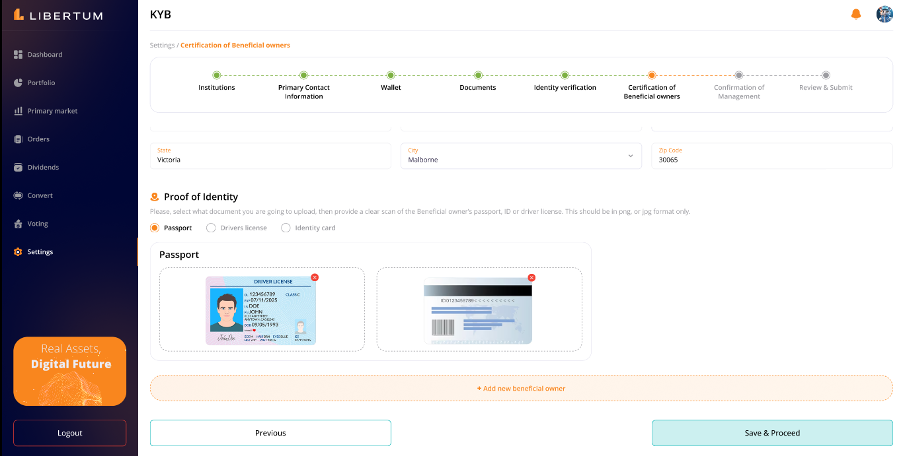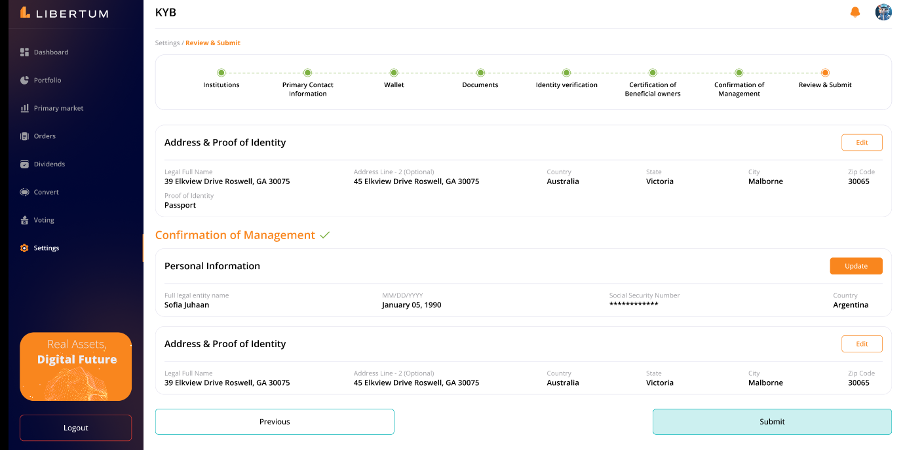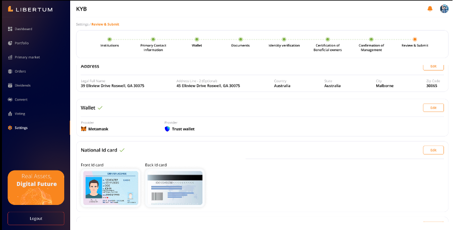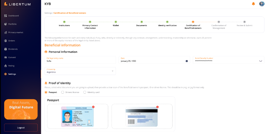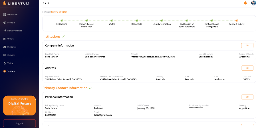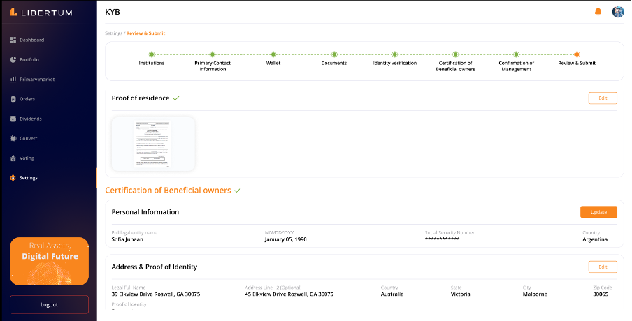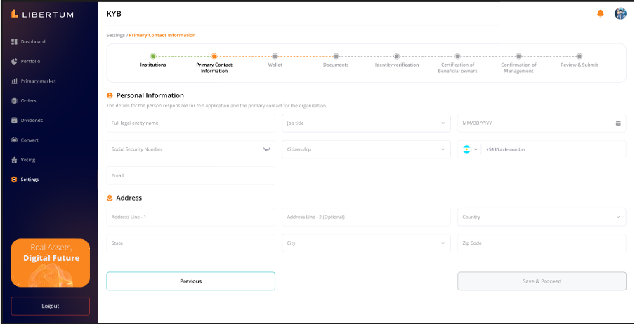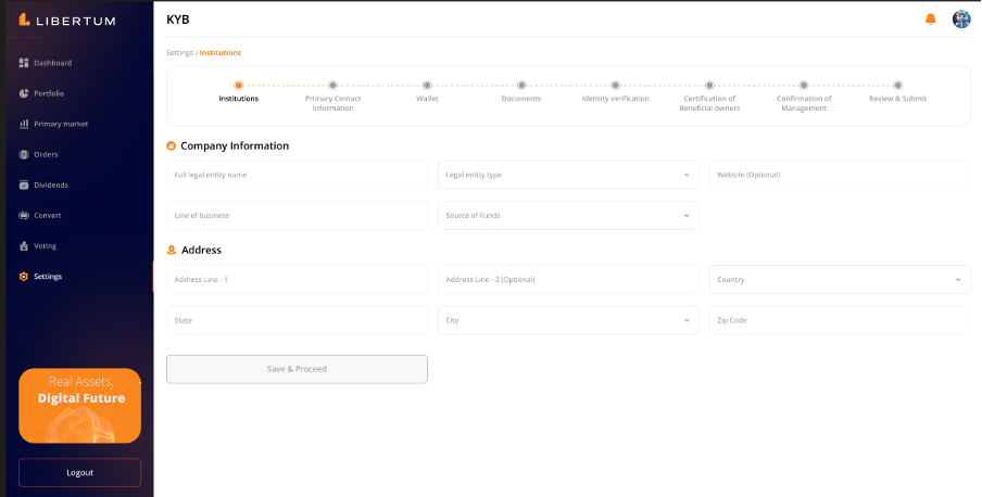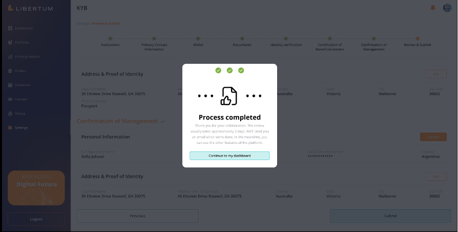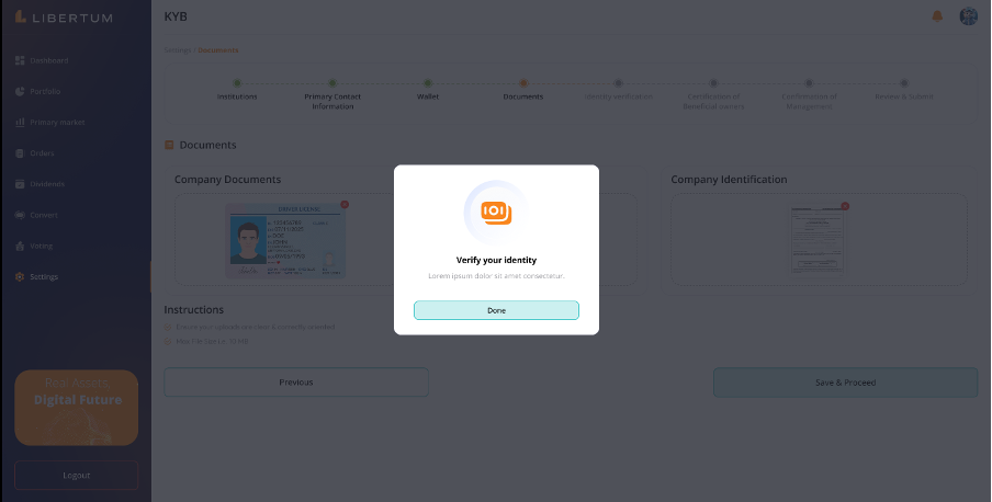 FR:034 The user must click on the “Complete Onboarding” process to complete the KYB of the institution to get access to the platform and enable trading/investment on the platform.