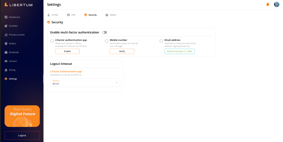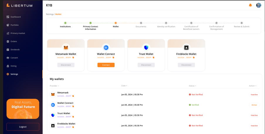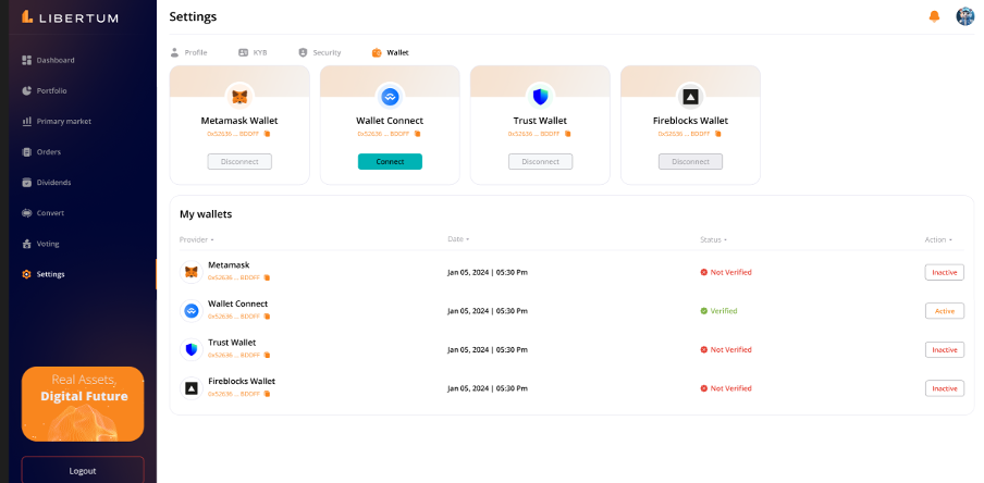 FR:167 The user must click on the “Wallet Connect” to connect their Wallet on the Libertum Platform from the Wallet 3 Modal option.