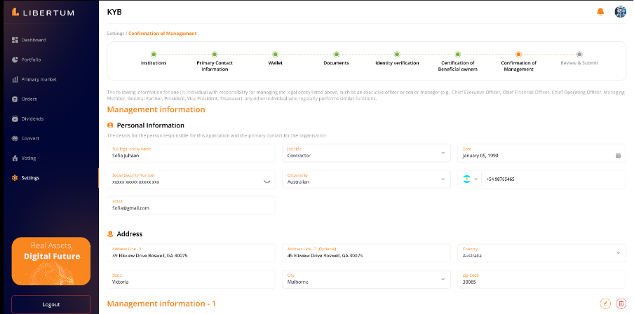 This section is non editable and only allow users to view the information/details submitted by them at the time of KYB to Sumsub, which are as follows-