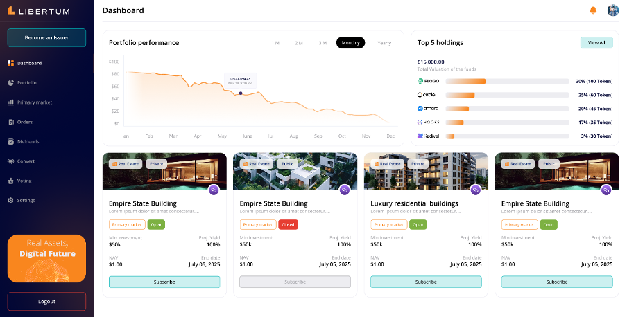 \ ○ Active Proposals: Show voting options (Yes, No) for investors to cast their votes.