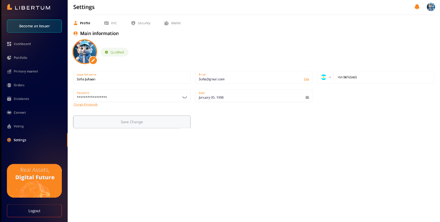 FR:162 The user must click on “Change Password” if they wish to change the password of their Libertum Platform. On clicking the “Change Password” a pop-up screen will appear which will direct them to enter the old password, new password, confirm the new password and then click on “Save” to change the password successfully.