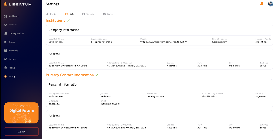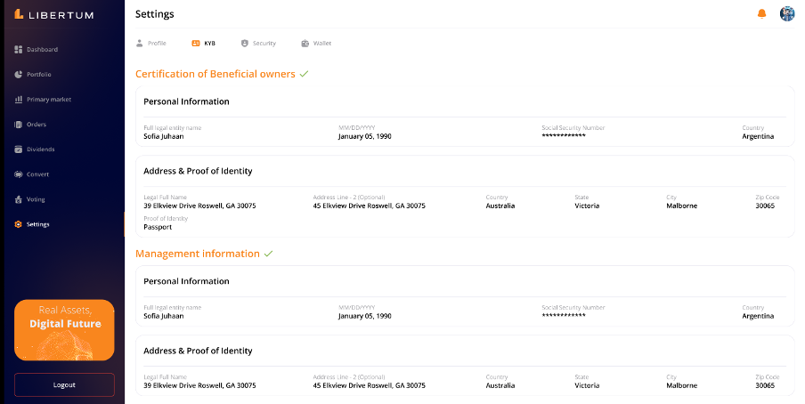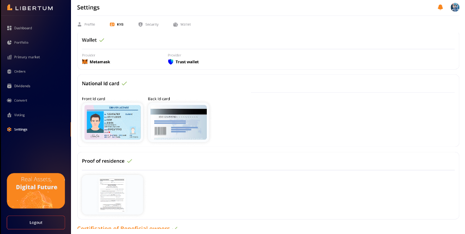 “KYB” section under the Settings tab manages all the KYB related functionalities of the user.