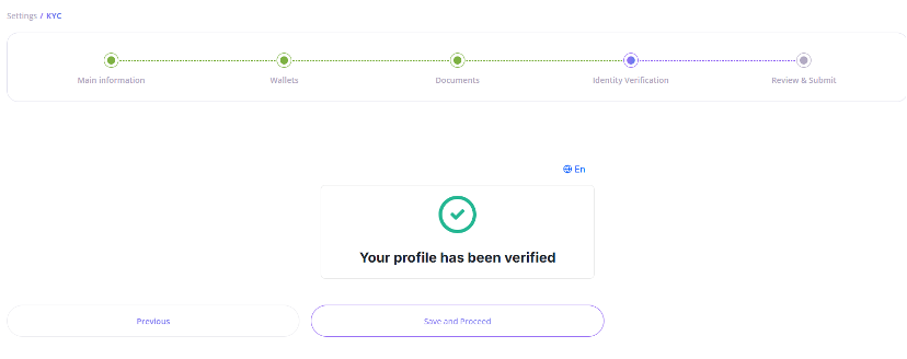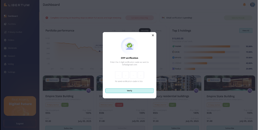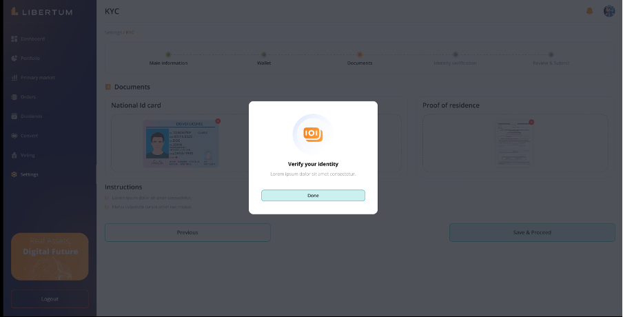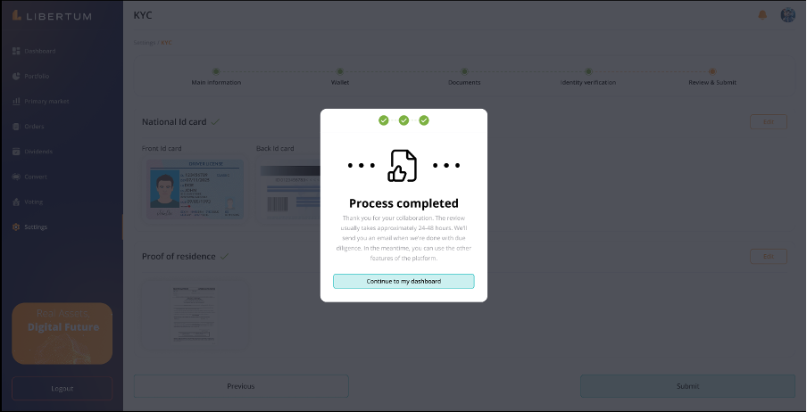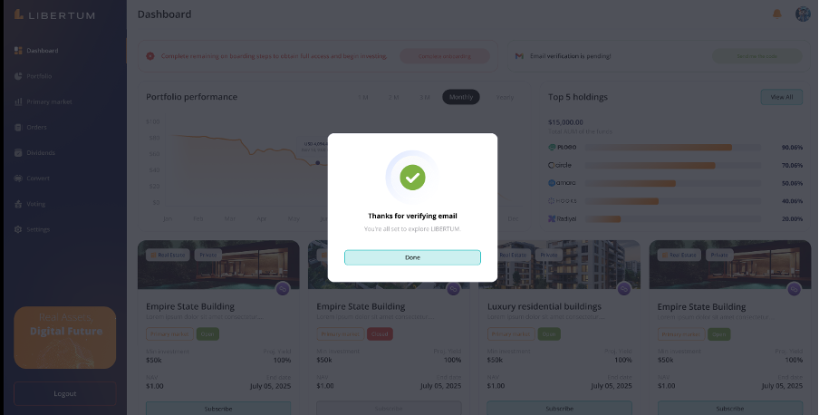 FR:044 The Investor must click on the “Done” button to confirm the verification and move to the Dashboard screen.