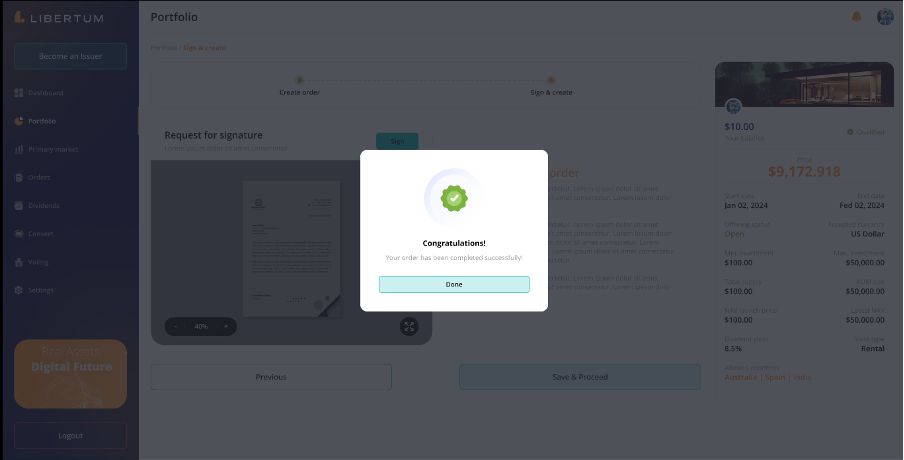 FR:124 The investor must click on the “Confirm” button. Upon clicking “Confirm,” a confirmation modal will appear.