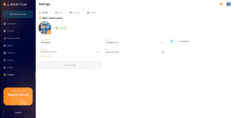 FR:129 The user must click on “Change Password” if they wish to change the password of their Libertum Platform. On clicking the “Change Password” a pop-up screen will appear which will direct them to enter the old password, new password, confirm the new password and then click on “Save” to change the password successfully.